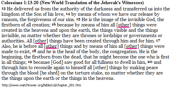 **JWs teach that Jesus was created by Jehovah, so when they come to Col. 1:16-17 which teaches Jesus created all things, they have to insert “other” or Jesus would have created Himself too. With their NWT, He created all [other] things.
